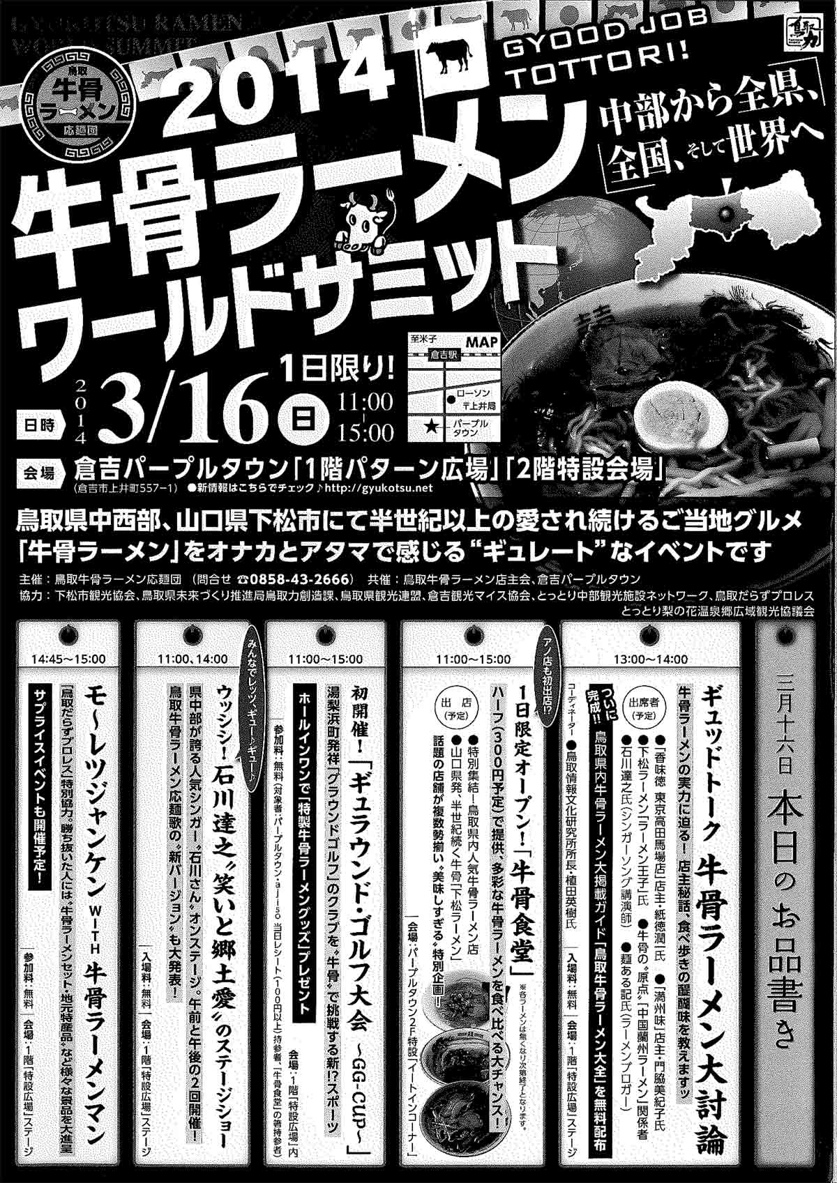 下松(くだまつ)ラーメン関係者にとって、以前から気になる存在だった鳥取牛骨ラーメン。牛骨ラーメンの集積地は、全国でも下松と鳥取県中西部に限られており、しかも両地とも半世紀以上前から独自に発展してきた歴史があります。大衆的な味の文化が、ごく限られた地域にポツン、ポツンと存在していたのは大変珍しいことです。そんな鳥取では、3月16日(日)に『2014牛骨ラーメンワールドサミット』が開催されるそうです。