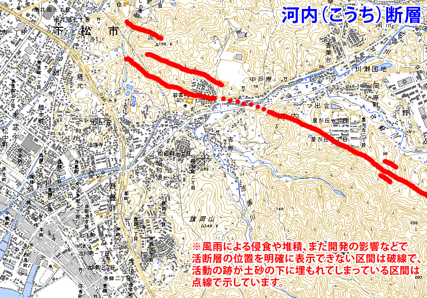 人口が増えている下松市ですが、そこは地震列島日本の一部。やはり、活断層なるものが存在します。2008年に国土地理院が発表した河内断層(こうちだんそう)を見ると、下松市の市街地に近く、2つの団地を貫き、下松高校のすぐ北を走っているのが確認できます。