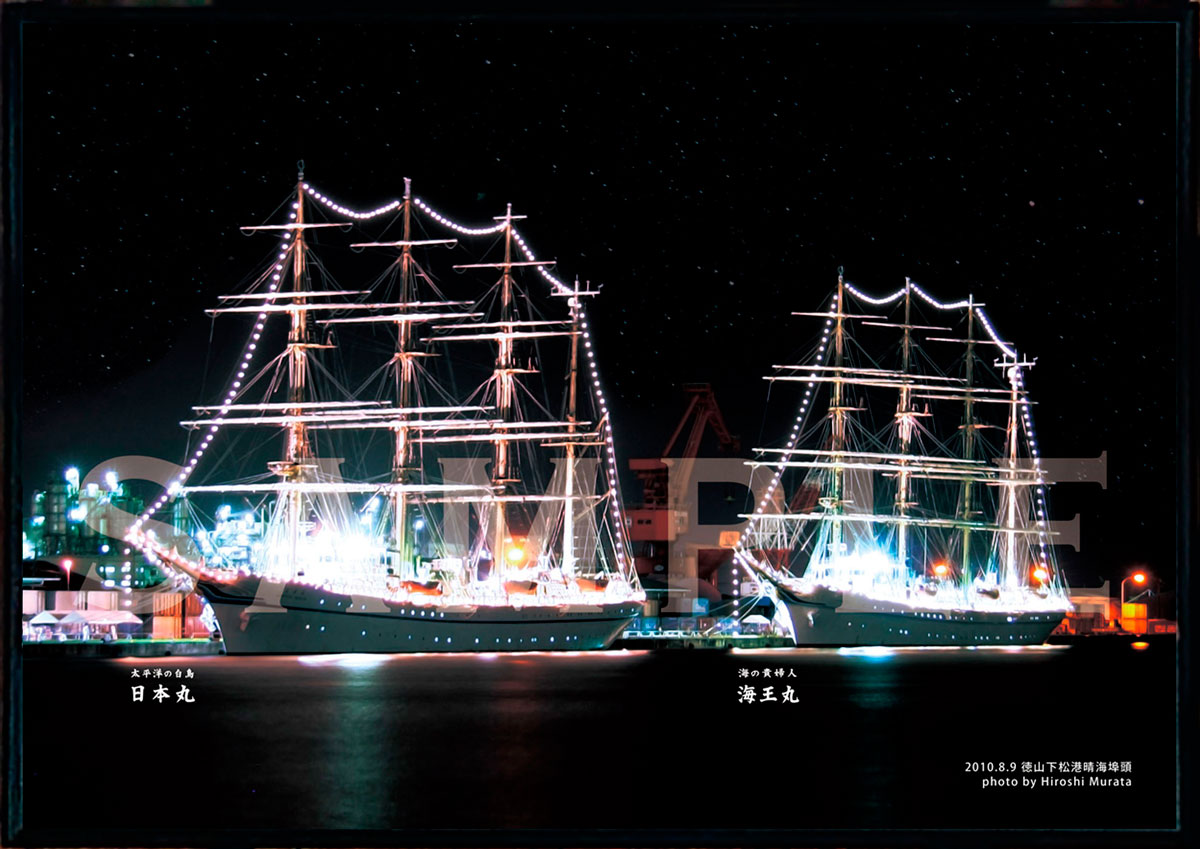 - 筆者が撮影した徳山下松港に寄港した「日本丸・海王丸」のA2サイズアートパネル1点。黒のアルミフレーム。非売品。ご寄付後1か月以内にお届け予定