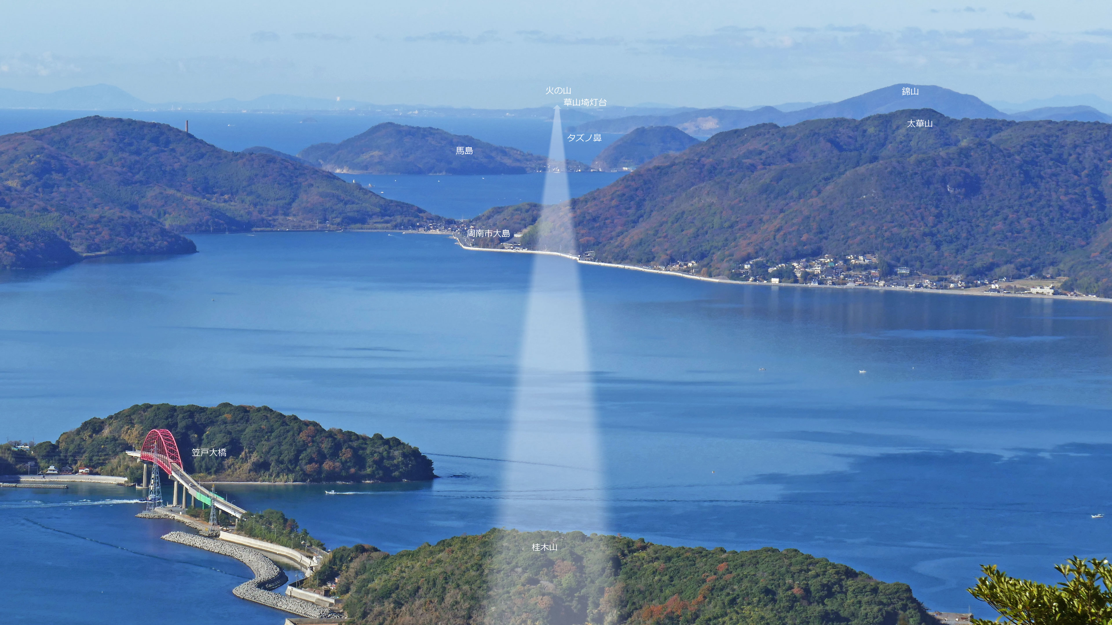 茶臼山から西には桂木山、草山埼灯台、下関火の山が一直線! 茶臼山から東には、石城山までが直線で、そこからやや北向きに折れ三ヶ岳、銭壷山、倉橋島、大三島・鷲ヶ頭山・・・最終的には奈良の都までつながります。こうした烽火ネットワークは時代によって、大内氏(鷲頭氏)以外にも、朝廷や幕府が主導権を持ち、毛利も活用していたと思われます。